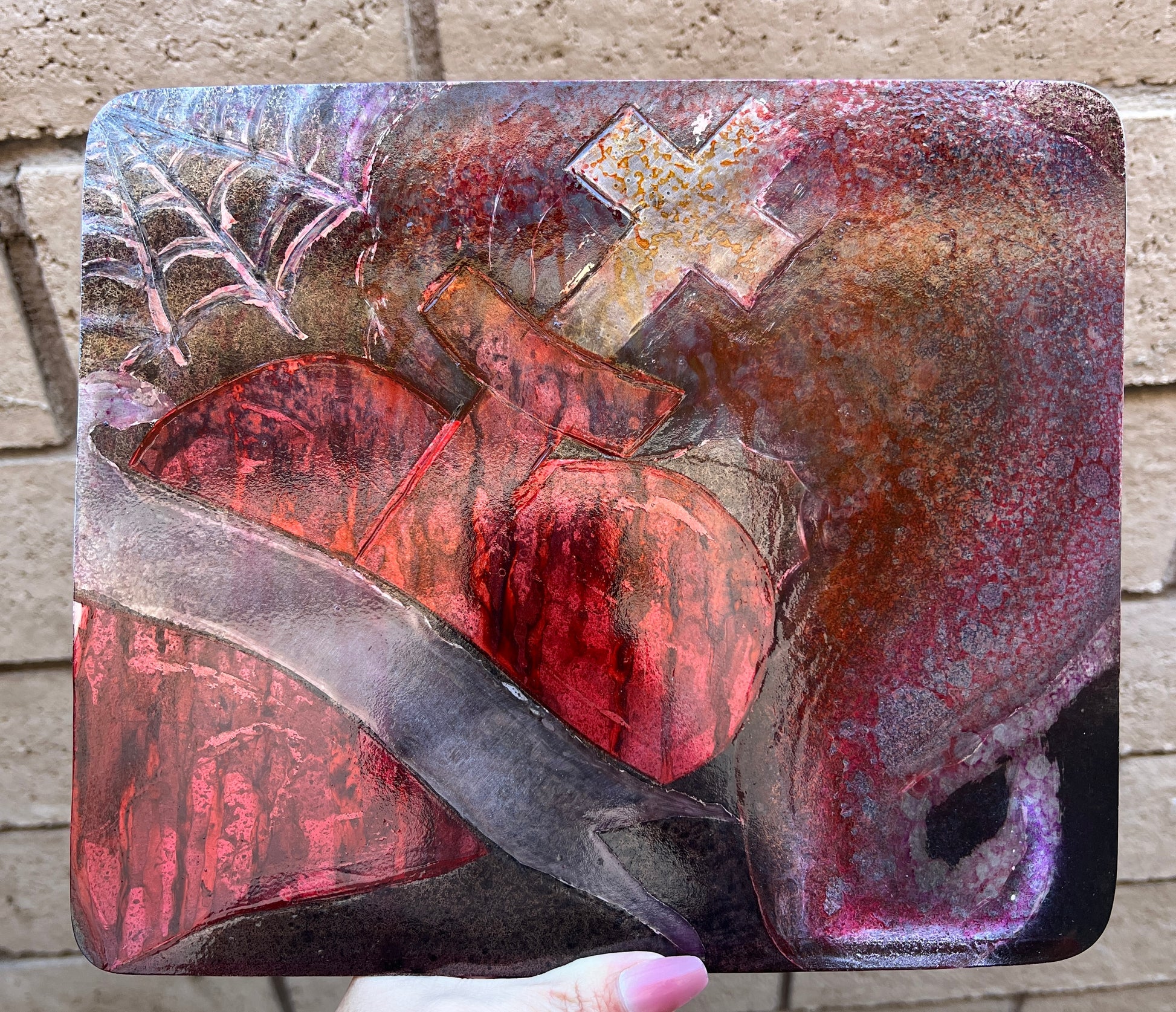 This is a custom art metal panel. Introducing our striking Fire Red Heart Cross Banner metal panel, a bold statement piece for both indoor and outdoor spaces. Crafted with precision and passion, this artwork combines intricate detailing with a fiery patina finish, creating a captivating focal point wherever it's displayed. Whether adorning your living room wall or adding a touch of flair to your garden, this versatile piece is sure to ignite conversations and inspire admiration with its powerful symbolism and stunning design.