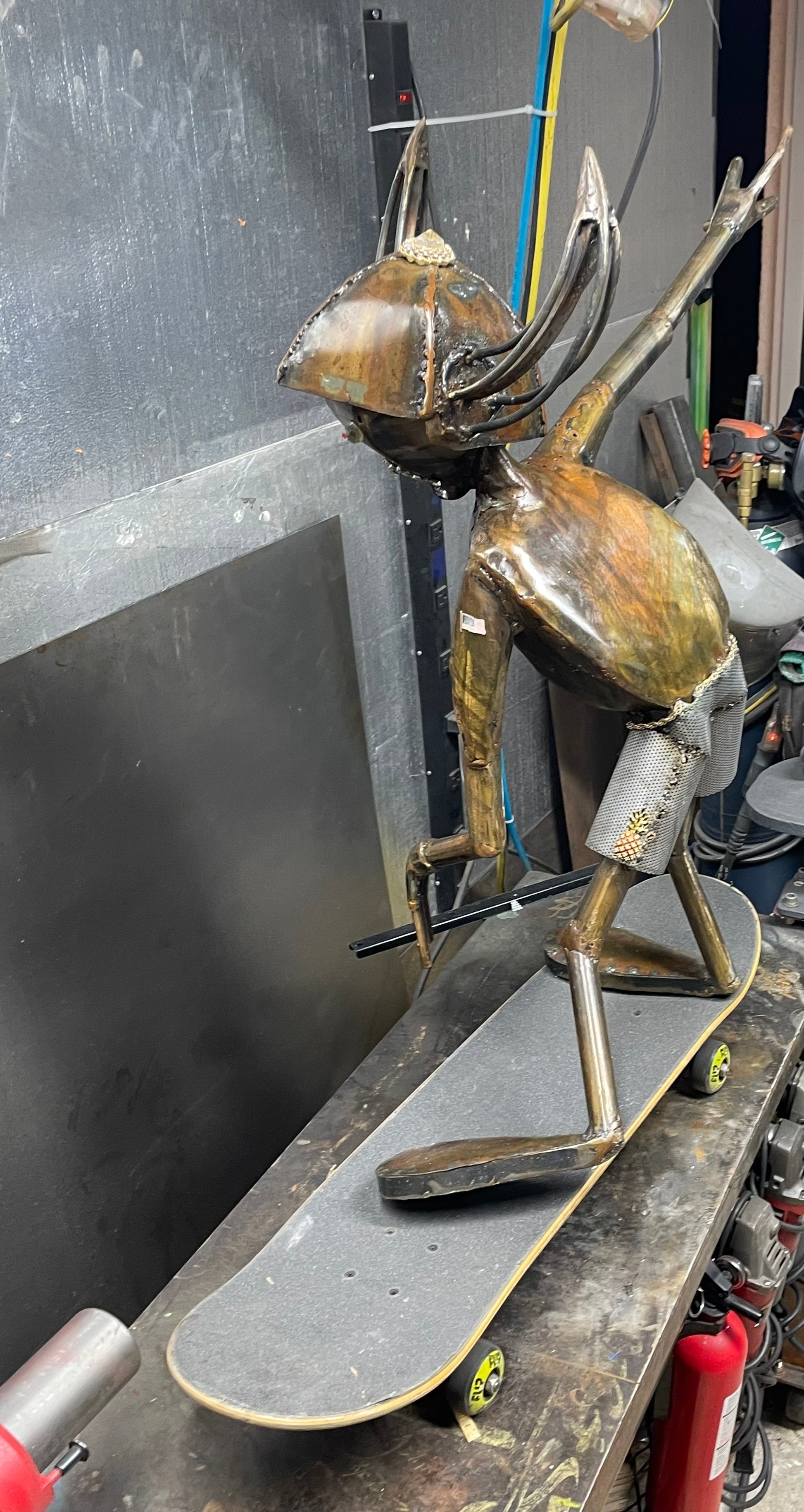 Sculpture can be placed on surfboard, skateboard or anything! He can also be placed upside down.