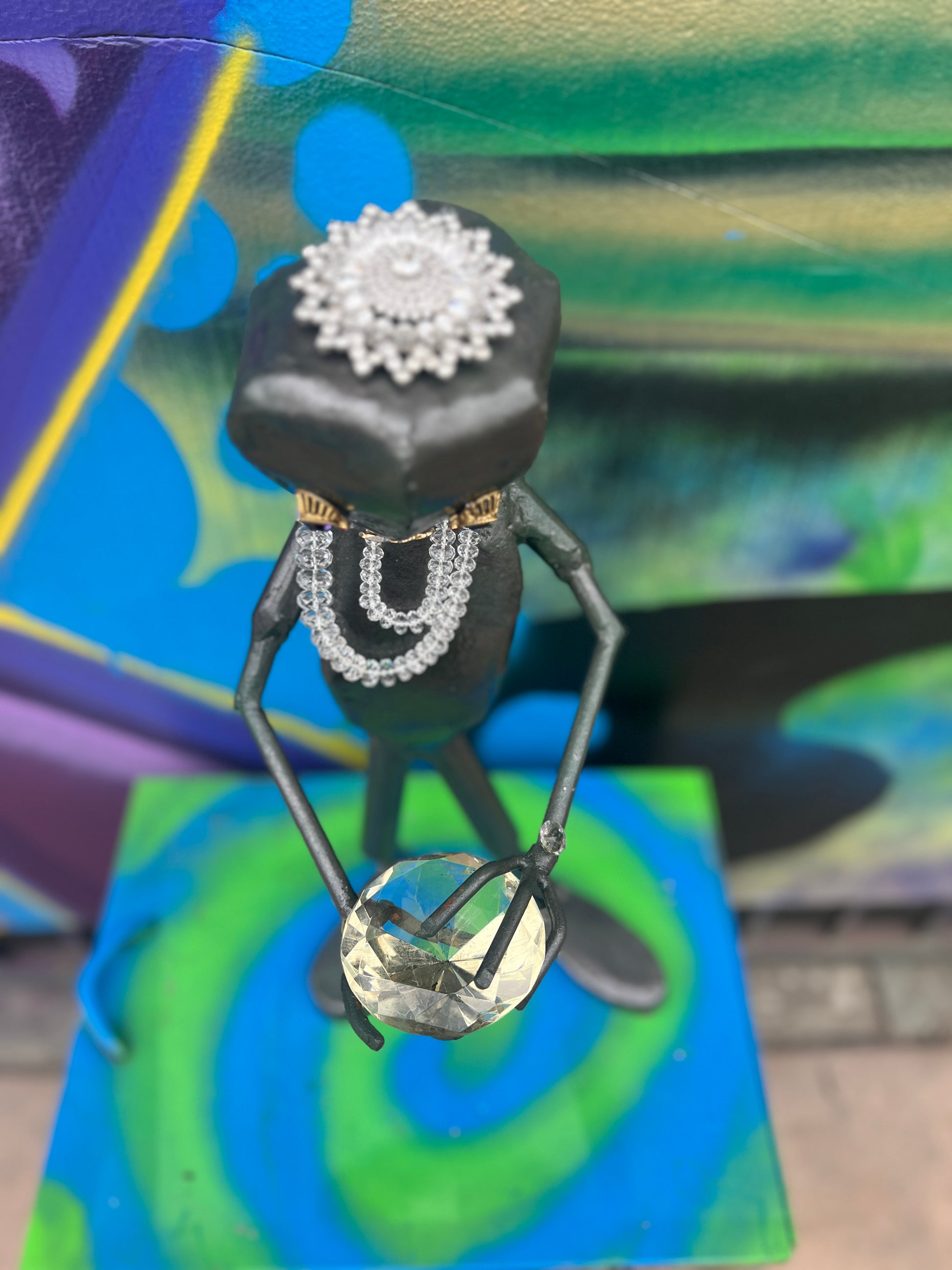 Introducing "Stellar Sovereign": This custom alien metal art statue radiates an aura of cosmic majesty, standing tall with a commanding presence. In her outstretched hands, she cradles a colossal diamond, a symbol of her unearthly wealth and power. Adorned with intricate jewelry that adorns her elongated limbs and regal features, she exudes an air of opulence and refinement.