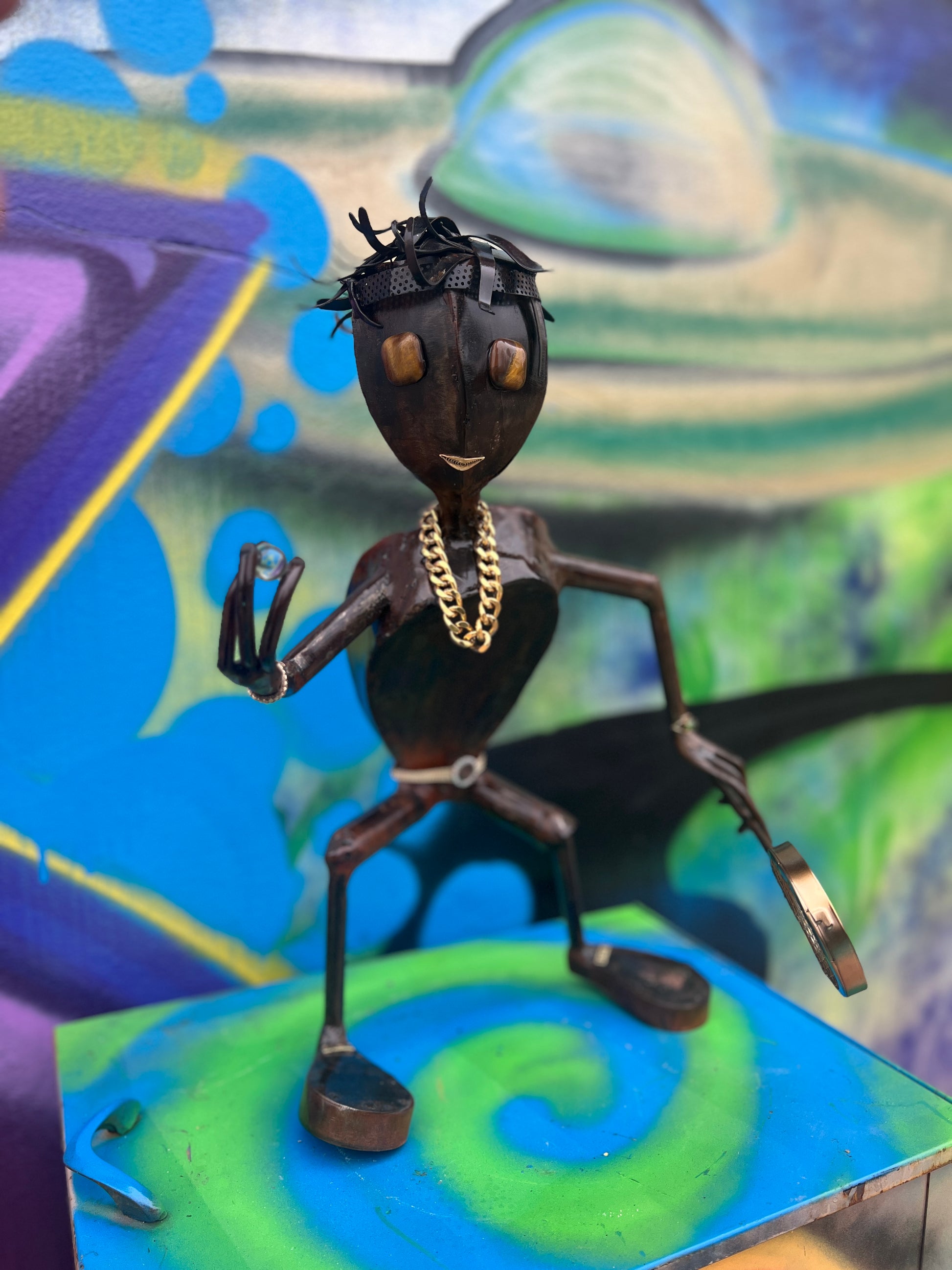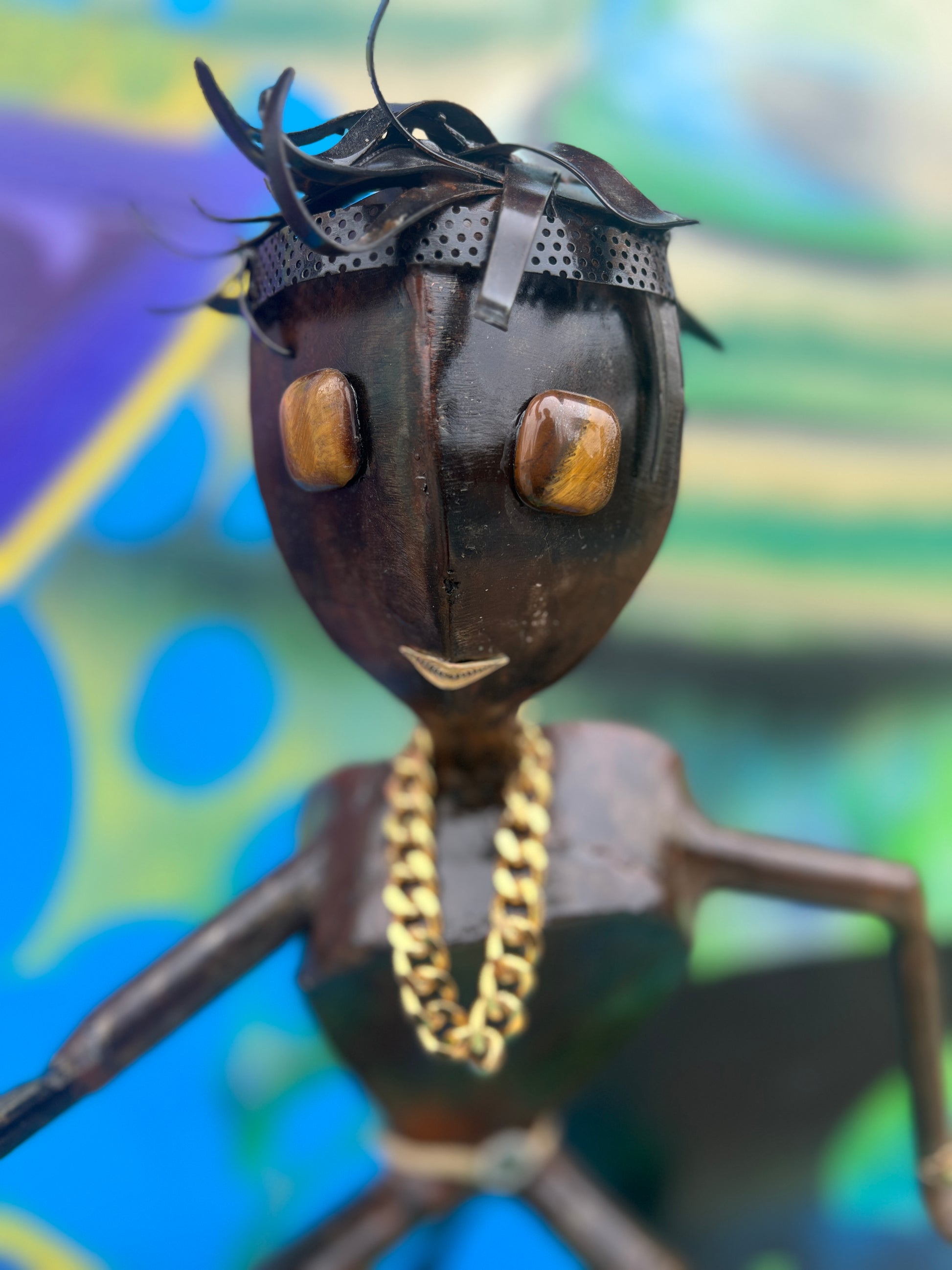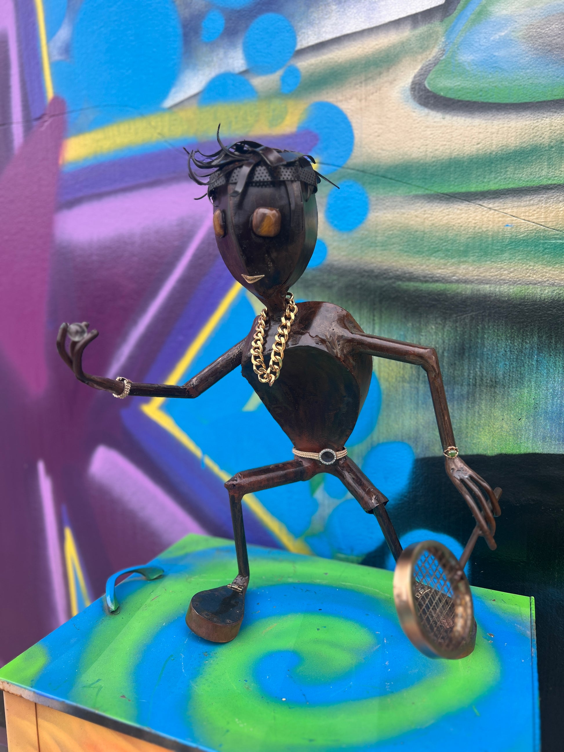 Presenting "Galactic Serve": This custom metal art sculpture showcases an otherworldly tennis player, poised in mid-serve on a court that seems to transcend earthly boundaries. Crafted from gleaming steel, the alien athlete possesses a lithe and graceful form, with elongated limbs and a head adorned with intricate metallic patterns that hint at its extraterrestrial origins.
