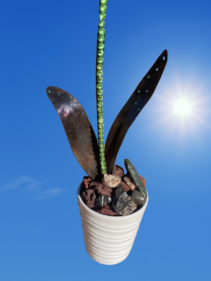 Behold the elegance of the Custom 5-petal Metal Flower Rhinestone Sculpture in Pot. Crafted with precision, each metal petal delicately curves to form a blooming flower, accented with sparkling rhinestones that catch the light with every angle. Planted in a charming pot, this sculpture adds a touch of whimsy and sophistication to any space, radiating beauty and grace.